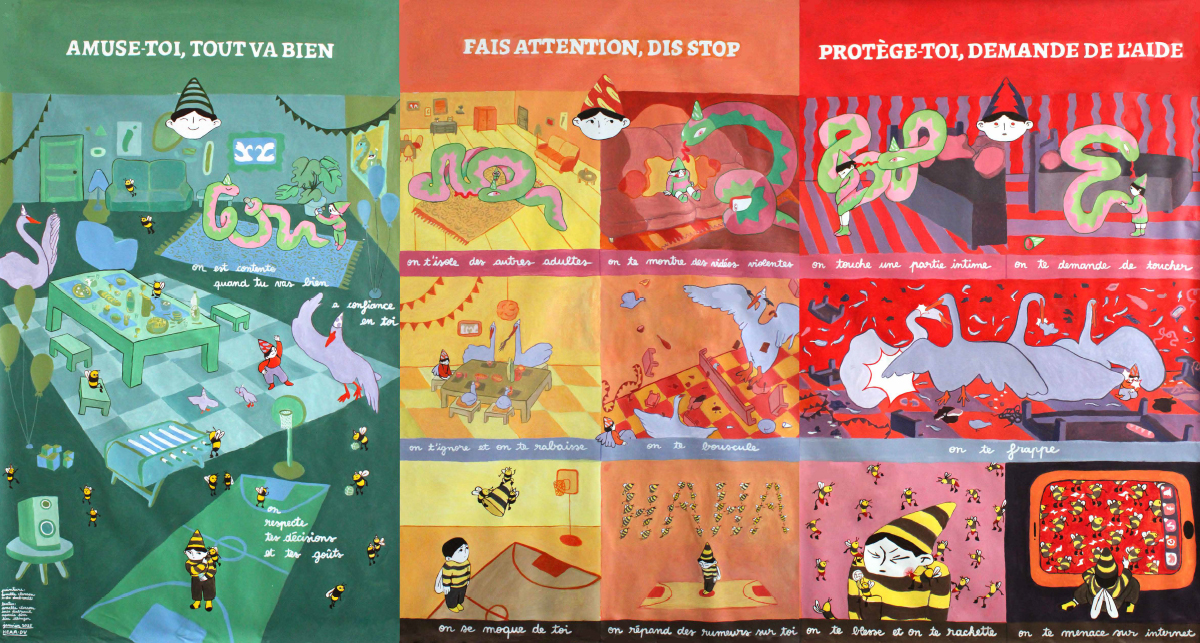 – une grande fresque illustrée pour le couloir du service pédiatrique à propos des violences sur les enfants ;