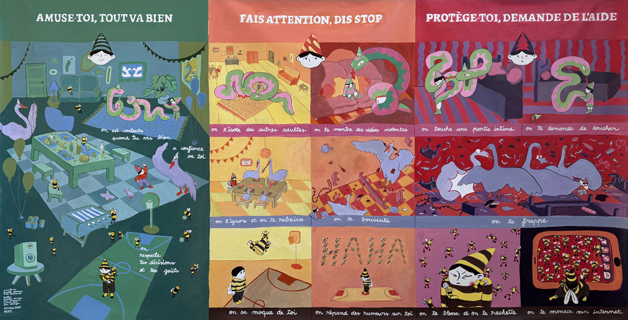 – une grande fresque illustrée pour le couloir du service pédiatrique à propos des violences sur les enfants ;